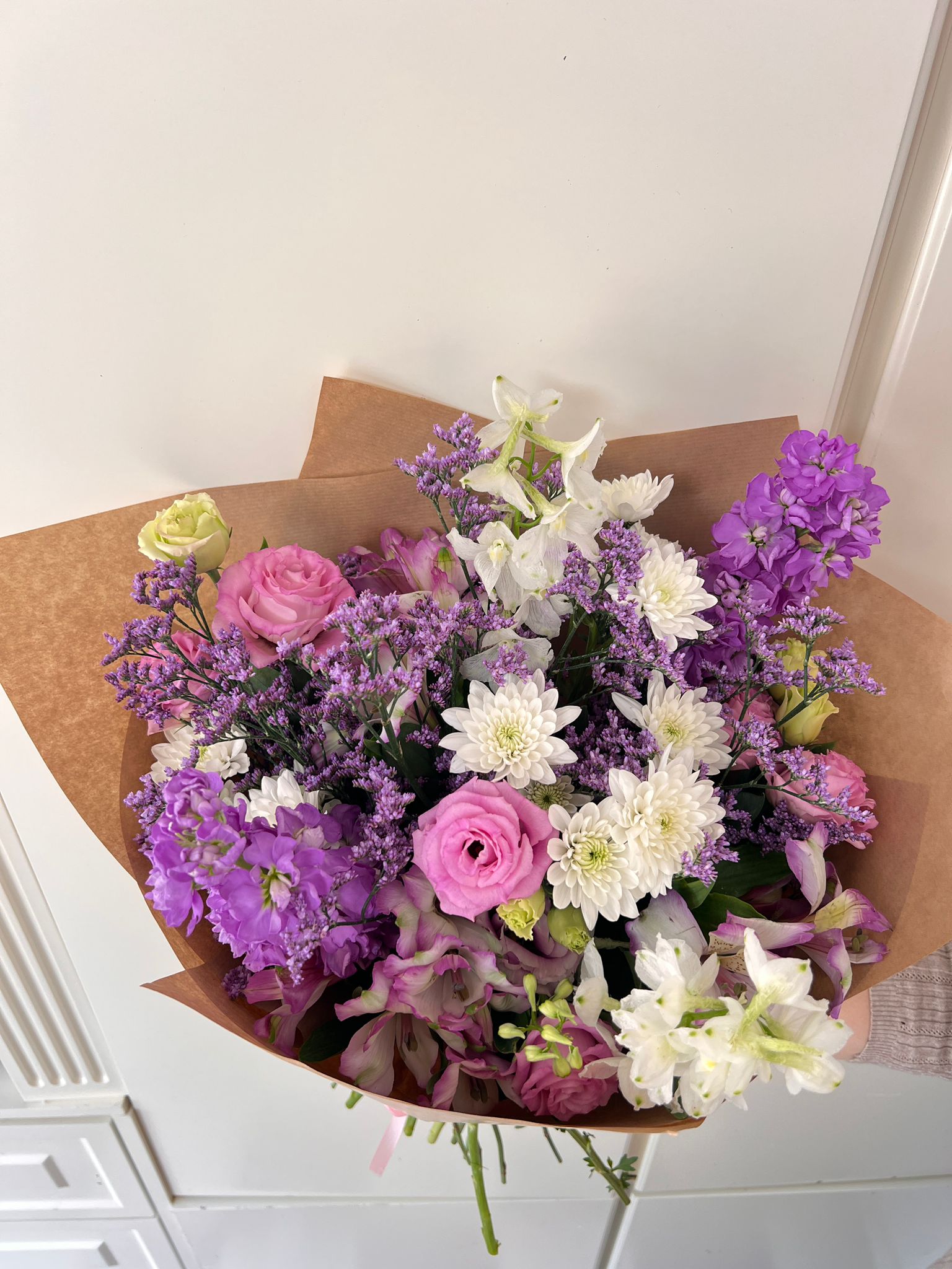 הזר כולל פרחים משתנים לפי המלאי הקיים בחנות , גווני הזר הם על בסיס סגול , לבן , ורוד עטוף באריזה מהודרת