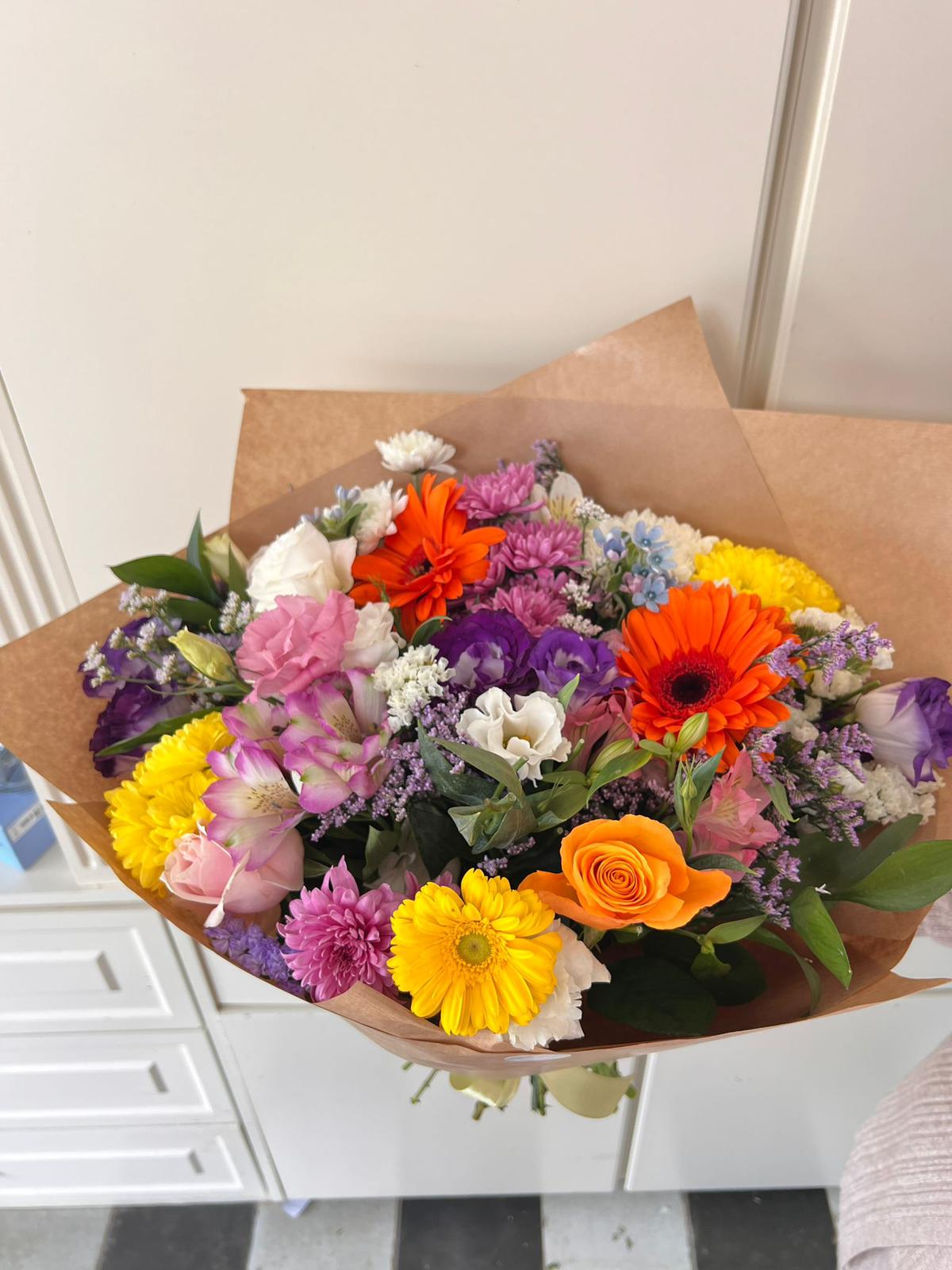 זר פרחים מפנק ויפה עם מגוון פרחים צבעונים המשתנים בהתאם למלאי היומי , המכיל 35 ענפי פרחים . התמונה להמחשה בלבד .
